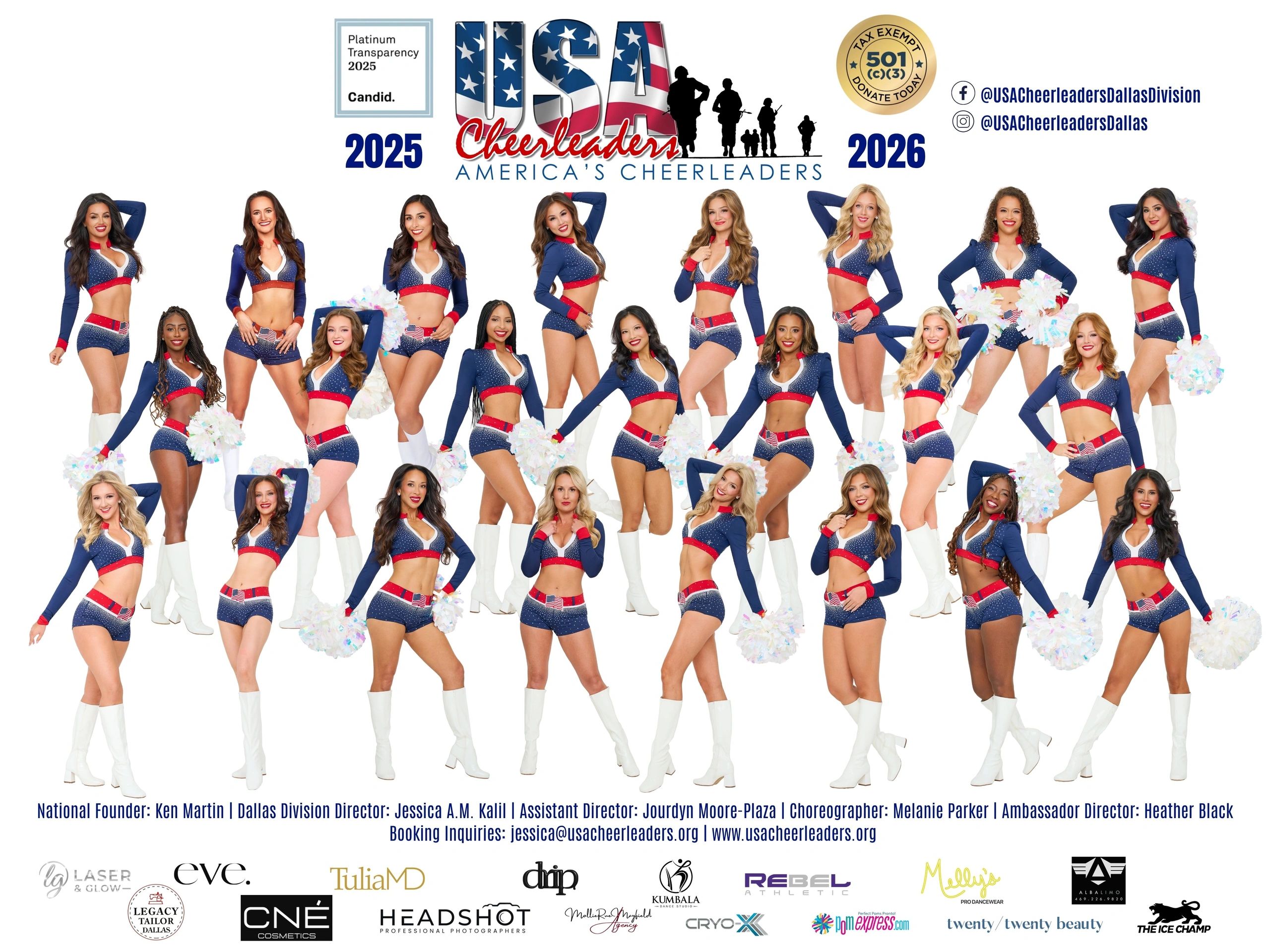 The USA Cheerleaders, a dedicated and patriotic group of professional cheerleaders, with unwavering respect for our military, first responders, our communities, the flag, and our country. Our mission is to support our military, first responders, their families, our communities and every citizen of the United States. We honor our American heroes past, present, and future with a determined sense of patriotic duty, ensuring that they are not forgotten. .